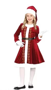 W zestawie znajdują się: sukienka, czapka, pasek. Sukienka z długim rękawem, wykonana materiału imitującego welur. Na kołnierzu, mankietach i u dołu sukienka obszyta białym futerkiem. Zapinana z tyłu na rzep.