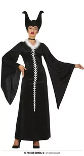 Zestaw zawiera: suknię, nakrycie głowy z rogami. Długa, czarna suknia z białym futerkiem. Skład: 100% poliester.