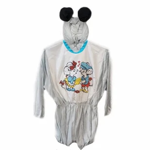 Strój dziecięcy myszki. Produkt w kolorze szaro-białym. Składa się z dwóch elementów: -kostiumu, -czapeczki. Kostium jest w odcieniu jasnoszarym z nadrukiem ...