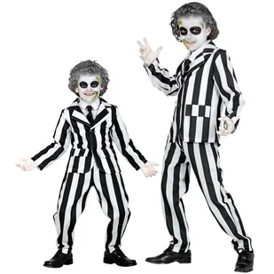 Zestaw zawiera: - marynarkę, - spodnie, - krawat. Strój w czarno-białe paski. Marynarka zapinana na guziki. Spodnie mocowane na gumce w pasie. Krawat w kolor...