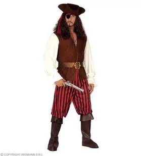 STRÓJ PIRAT MORSKI BORDO; Zestaw zawiera: bluzkę, wszytą kamizelkę wiązaną rzemykami, spodnie w pionowe paski, piracki kapelusz, pasek z klamrą, nakładki na buty. Kolor: biało-brązowo-bordowo-czarny.