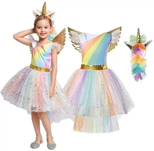 Dodatkowo w zestawie z sukienką, otrzymujecie Państwo opaskę z rogiem, uszami i welonem oraz skrzydła na gumce. Kostium idealny dla małych dziewczynek, a zwłaszcza dla wielbicieli Jednorożców, dobrze wykonany w odcieniach tęczy z elementami w kolorze złotym. Dzieci zakładając strój mogą poczuć się jak ulubiona postać. Kostium gwarantuję fantastyczną zabawę rozwijającą wyobraźnię dziecka. Kolory naszych produktów na zdjęciach mogą się nieznacznie różnić od rzeczywistych - wynika to z różnych ustawień dostępnego sprzętu komputerowego, a w szczególności ustawień monitora i karty graficznej.