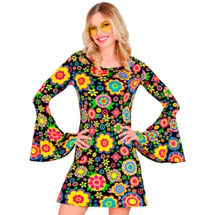 Sukienka w stylu lat 70tych. Produkt czarny zdobiony kwiatami. Rękaw długi rozrzeszany.