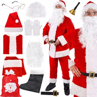 11 Rozmiar: uniwersalny Kolor wiodący: czerwony Wielokrotnego użytku: tak W zestawie znajdują się: Czapka Św. Mikołaja Kurtka z białymi mankietami i lamówką Spodnie Peruka Broda z gumką Pasek z klamrą Okulary Rękawiczki Buty Dzwonek Worek Wymiary, mierzone na płasko: