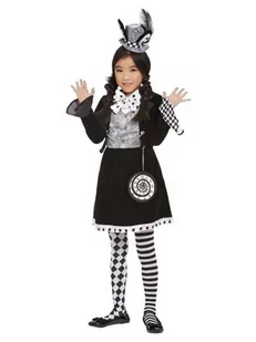 Czarna sukienka z wszytą kamizelką oraz kokardą. W pasie wszyta gumka. Brokatowa zawieszka na rzep w kształcie zegara na łańcuszku. Ozdobny łańcuszek zapinany na rzep. Czarna opaska w kształcie cylindra.