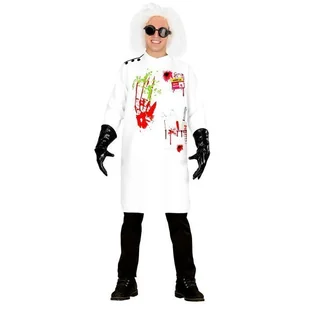 Zestaw zawiera: fartuch, rękawiczki. Strój szalonego naukowca. Fartuch w kolorze białym zdobiony plamami. Rękawicze w kolorze czarnym. Zaskocz swoich znajomy...