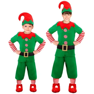 Strój Wesoły elf dla chłopców, zestaw zawiera: bluzkę, spodnie, pasek, czapkę, nakładki na buty, skład: 100% poliester, kolor: zielono-czerwony, strój uszyty...