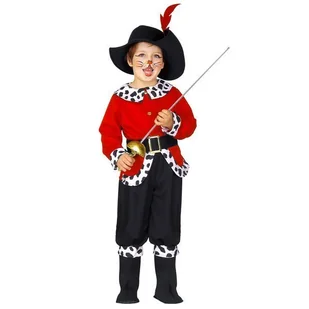 Zestaw zawiera: kapelusz wygięty z czerwonym piórkiem, koszulę, wykończona materiałem białym w czarne łatki. spodnie, nakładki na buty w górnej części zdobio...
