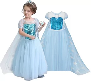 Rozmiar 128/134 (z metki 130) Długość całkowita sukienki od ramienia do końca halki - ok. 84 cm (bez trenu) Szerokość pod paszkami - 30 cm x2 Szerokość w pasie - 28 cm x2 (uciągliwa w okolicy pasa na plecach) Kostium dla dziewczynek w wieku 8-9 lat Wymiary mierzone ręcznie, na płasko. Strój idealny dla małych dziewczynek, a zwłaszcza dla Wielbicielek animacji Krainy Lodu, dobrze wykonany, w odcieniach błękitu i bieli. Dzięki naszej propozycji każda dziewczynka może poczuć się jak jej ulubiona bajkowa postać. Ciekawe przebranie to zawsze podróż do magicznej baśniowej krainy, która pozwoli zachować dzieciństwo w pamięci.