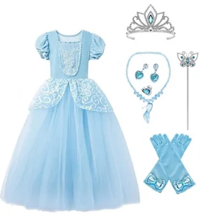 STRÓJ PRZEBRANIE KOSTIUM KOPCIUSZEK + RĘKAWY + ZESTAW DODATKÓW OFERTA DOTYCZY STROJU W ROZMIARZE 110/116 (z metki 120) Opis produktu: Strój odwzorowany na podobieństwo sukni kultowej bohaterki Elli z filmu "Kopciuszek", Suknia wykonana z pięknych materiałów w odcieniach koloru niebieskiego i błękitnego, Całość sukni dopełniona białymi akcentami, Sukienka z bufiastymi rękawkami, Górna część sukni welurowa, dolna część sukienki wykończona błękitnym tiulem, Gorset został ślicznie ozdobiony koronką oraz kwiatowym wzorem, Sukienka na bawełnianej podszewce, składająca się z 1 warstwy atłasowej halki oraz 2 warstw tiulu, Długość sukienki do połowy łydki, Zakładana przez głowę, Rękawiczki, wykonane z niebieskiej lycry – rozciągliwy materiał, rozmiar jest uniwersalny - 2 sztuki, Pięknie połyskujące kolczyki, pierścionek oraz naszyjnik w kolorze niebieskim, w zestawie z rękawami naramiennymi, koroną i berłem, co czyni ją idealną propozycją dla młodych dziewczyn, które lubią błyszczeć i czuć się jak księżniczki Ta urocza sukienka to idealna opcja na przyjęcia urodzinowe, sesje fotograficzne lub na specjalne okazje : ) Serdecznie polecamy! Strój idealny dla małych dziewczynek, a zwłaszcza dla wielbicielek Elli z filmu Kopciuszek , dobrze wykonany, w odcieniach koloru niebieskiego. Dzięki naszej propozycji każda dziewczynka może poczuć się jak jej ulubiona bajkowa postać. Ciekawe przebranie to zawsze podróż do magicznej baśniowej krainy, która pozwoli na długo zachować dzieciństwo w pamięci.