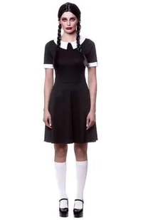 Ten kostium w stylu rodziny Addamsów składa się z czarnej sukienki do kolan z białym kołnierzykiem i białymi wykończeniami na rękawach. W zestawie tylko suki...