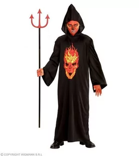 STRÓJ DIABEŁ DIABEŁEK; Długa szata z kapturem z nadrukiem płonącej czaszki. Kolor: czarno-czerwony.