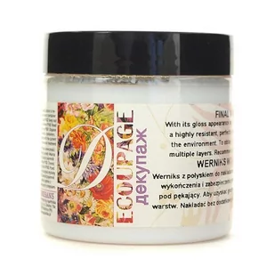 Werniks z połyskiem do nakładania na dekorację w celu uzyskania błyszczącego wykończenia i zabezpieczenia przed ścieraniem lub jako werniks podkładowy pod pękający. Aby uzyskać gładką powierzchnię konieczne jest nałożenie kilku warstw. nakładać bez dodatkowego rozcieńczania przy pomocy suchego pędzla.