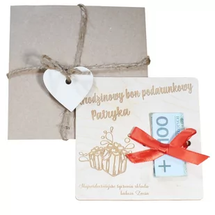 Dokonując zakupu otrzymują Państwo: Solidną tabliczkę wykonaną z wysokiej jakości sklejki brzozowej, Wstążkę w kolorze czerwonym do mocowania banknotów, Kopertę - do wyboru ECO, białą lub perłową. Domyślnie dajemy kopertę ECO. Sznurek jutowy do samodzielnego przewiązania koperty, Serduszko drewniane, Podczas zamawiania należy podać kolor koperty, imię solenizanta oraz informację o darczyńcy. Można również przysłać własne, krótkie, życzenia.