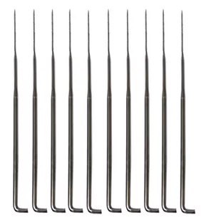 Zestaw 10 igieł do filcowania: cienkich. Przeznaczone do filcowania na sucho i nadawania filcowanym przedmiotom kształtu. Posiadają specjalne harpuny na dł 2cm, które podczas nakłuwania plączą wełnę zbijając ją w filc. Igły są uniwersalne i pasują do większości obsadek na igły Igły cienkie mają dł 7,8 cm Wykonane z żelaza. Przygotowane w plastikowej fiolce.