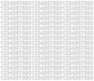 Cyfry wycinane ploterowo po obrysie (bez tła). Ilość cyfr jak na zdjęciu głównym. Kolor białe matowe Rozmiar arkusza 21x25 cm Wysokość znaku 1 cm Trwałość 3-4 lata Grubość folii 70 mikronów Rodzaj folii Oracal 641