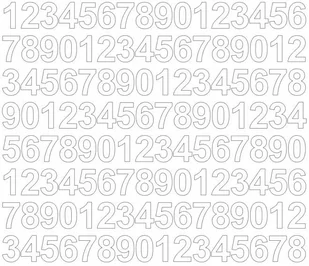 Cyfry wycinane ploterowo po obrysie (bez tła). Ilość cyfr jak na zdjęciu głównym. Kolor biały z połyskiem Rozmiar arkusza 21x25 cm Wysokość znaku 2 cm Trwałość 3-4 lata Grubość folii 70 mikronów Rodzaj folii Oracal 641