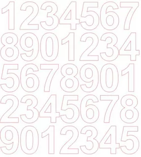 Cyfry wycinane ploterowo po obrysie (bez tła). Ilość cyfr jak na zdjęciu głównym. Kolor biały z połyskiem Rozmiar arkusza 21x25 cm Wysokość znaku 4 cm Trwałość 3-4 lata Grubość folii 70 mikronów Rodzaj folii Oracal 641