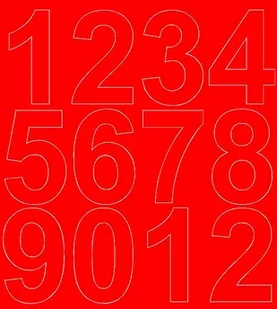 Cyfry wycinane ploterowo po obrysie (bez tła). Ilość cyfr jak na zdjęciu głównym. Kolor czerwony matowy Rozmiar arkusza 21x25 cm Wysokość znaku 7 cm Trwałość 3-4 lata Grubość folii 70 mikronów Rodzaj folii Oracal 641