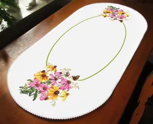 Zestaw do haftu - Bieżnik owalny - Kolorowe kwiaty Zestaw do haftu zawiera: bieżnik owalny Aida z koronką 50x110 cm, 14ct (gęstość 54 oczek/10 cm), 100% bawełna, biała koronka, mulinę, igłę oraz kolorowy wzór graficzny. Rozmiar w krzyżykach: 270 x 597 Rozmiar w cm: 50 x 110 Rozmiar w calach: