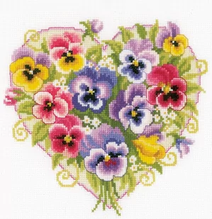 Zestaw do haftu - Bratki w sercu Zestaw do haftu zawiera: kanwę Aida (100% bawełna) o gęstości 54 oczek/10 cm (14ct), kolor: biały, mulinę firmy DMC, igłę, czarno-biały wzór graficzny oraz instrukcję NL, EN, FR, DE, ES, SWE, IT, RU. Rozmiar w cm: 23 x 22 Ilość kolorów: