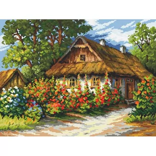Zestaw do haftu - Chata z malwami Zestaw do haftu zawiera: kanwę czystą typu Aida (100% bawełna) o gęstości 54 oczek/10 cm (14ct), mulinę, igłę oraz kolorowy wzór graficzny. Zestaw nie zawiera ramki. Rozmiar w krzyżykach: 216 x 162 Rozmiar w cm: