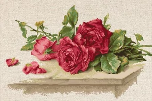 Zestaw do haftu - Czerwone róże Luca-S. Zestaw do haftu zawiera: kanwę czystą beżową gobelinową (100% len) o gęstości 80 oczek/10 cm (20ct), mulinę firmy Anchor, igłę oraz czarno-biały wzór graficzny. Rozmiar w cm: 31 x 19,5 Ilość kolorów: