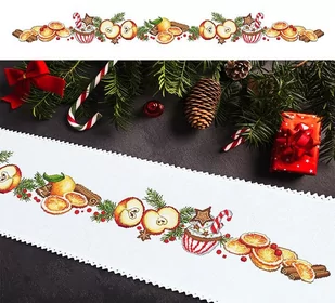 Zestaw do haftu - Długi bieżnik świąteczny Zestaw do haftu zawiera: bieżnik Aida z koronką 117x21 cm, 14ct (gęstość 54 oczek/10 cm), 100% bawełna, mulinę, igłę oraz kolorowy wzór graficzny. Rozmiar w krzyżykach: 631 x 113 Rozmiar w cm: 117 x 21 Rozmiar w calach:
