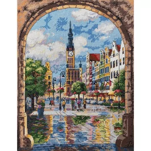 Zestaw do haftu - Gdańsk Zestaw do haftu zawiera: kanwę czystą beżową Aida Zweigart (100% bawełna) o gęstości 64 oczek/10 cm (16ct), mulinę firmy DMC, igłę oraz wzór graficzny. Instrukcja w języku angielskim. Zestaw nie zawiera ramki. Rozmiar w cm:
