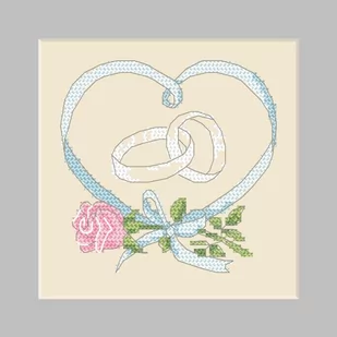 Zestaw do haftu - Kartka - Ślubne obrączki Zestaw do haftu zawiera: kanwę czystą typu Aida (100% bawełna) o gęstości 54 oczka/10 cm (14ct), mulinę, igłę, kolorowy wzór graficzny oraz kartę z kwadratowym passe-partout. Rozmiar w krzyżykach: 65 x 65 Rozmiar w cm: 16 x 16 Rozmiar w calach: