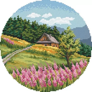 Zestaw do haftu - Letni pejzaż Zestaw do haftu zawiera: kanwę czystą typu Aida (100% bawełna) o gęstości 54 oczek/10 cm (14ct), mulinę, igłę oraz kolorowy wzór graficzny. Zestaw nie zawiera ramki. Rozmiar w krzyżykach: 108 x 108 Rozmiar w cm:
