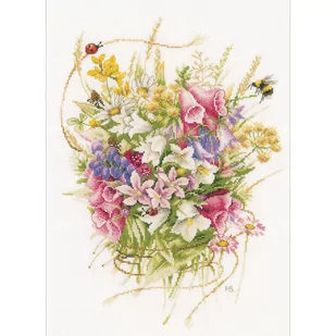 Zestaw do haftu - Letnie kwiaty Zestaw do haftu zawiera: kolorowe zdjęcie gotowego wyrobu, tkaninę, mulinę firmy DMC, igłę oraz czarno-biały wzór graficzny. Tkanina: bawełna (100% bawełna) o gęstości 10,5 nitki / cm (27ct). Kolor: biały. Całość zapakowana w eleganckie kartonowe pudełko w kolorze brązowym. Instrukcja w NL, EN, FR, DE, ES, SWE, IT, RU.