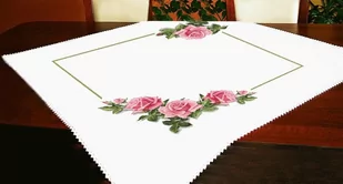 Zestaw do haftu - Obrus z różami 3D Zestaw do haftu zawiera: obrus Aida z koronką (100% bawełna) 90x90 cm (gęstość 54 oczek/10 cm - 14ct), mulinę, igłę oraz kolorowy wzór graficzny. Rozmiar w krzyżykach: 486 x 486 Rozmiar w cm: 90 x 90 Ilość kolorów: