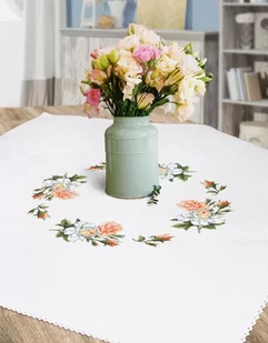 Zestaw do haftu - Obrus z różami Zestaw do haftu zawiera: obrus Aida z koronką (100% bawełna) 90x90 cm (gęstość 54 oczek/10 cm - 14ct), mulinę, igłę oraz kolorowy wzór graficzny. Rozmiar w krzyżykach: 486 x 486 Rozmiar w cm: 90 x 90 Ilość kolorów: