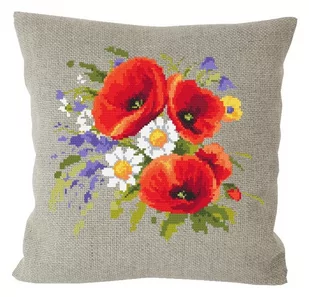 Zestaw do haftu - Poduszka lniana z makami Zestaw do haftu zawiera: materiał na poszewkę 40x40 cm - tył z zamkiem, przód kanwa typu AIDA o gęstości 38 oczek/10 cm - 9ct (100% len), mulinę, igłę oraz kolorowy wzór graficzny. Rozmiar w krzyżykach: 152 x 152 Rozmiar w cm: 40 x 40 Ilość kolorów: