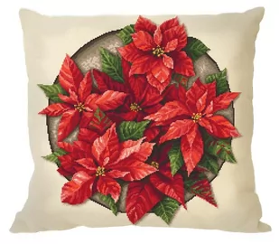 Zestaw do haftu - Poduszka - Poinsecja Zestaw do haftu zawiera: materiał na poszewkę 40x40 cm - tył z zamkiem (100% bawełny), przód kanwa typu AIDA o gęstości 54 oczek/10 cm - 14ct, mulinę, igłę oraz kolorowy wzór graficzny. Rozmiar w krzyżykach: 216 x 216 Rozmiar w cm: 40 x 40 Rozmiar w calach: