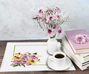 Zestaw do haftu - Serwetka z kwiatami Zestaw do haftu zawiera: serwetkę Aida z koronką (100% bawełna) o rozmiarze 45x45 cm, (gęstość 54 oczek/10 cm - 14ct), mulinę, igłę oraz kolorowy wzór graficzny. Rozmiar w krzyżykach: 243 x 243 Rozmiar w cm: 45 x 45 Rozmiar w calach: