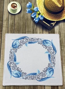 Zestaw do haftu - Serwetka z niebieskimi tulipanami Zestaw do haftu zawiera: serwetkę Aida z koronką (100% bawełna) o rozmiarze 45x45 cm, (gęstość 54 oczek/10 cm - 14ct), mulinę, igłę oraz kolorowy wzór graficzny. Rozmiar w krzyżykach: 243 x 243 Rozmiar w cm: 45 x 45 Rozmiar w calach: