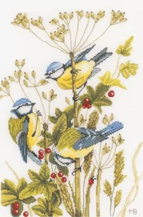 Zestaw do haftu - Sikorki modraszki Zestaw do haftu zawiera: kolorowe zdjęcie gotowego wyrobu, tkaninę, mulinę firmy DMC, igłę oraz czarno-biały wzór graficzny. Tkanina: bawełna (100% bawełna) o gęstości 10,5 nitki / cm (27ct). Kolor: biały. Całość zapakowana w eleganckie kartonowe pudełko w kolorze brązowym. Rozmiar w cm: