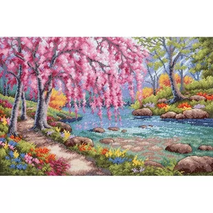 Zestaw do haftu - Wiśniowa zatoka Zestaw do haftu zawiera: kanwę czystą typu Aida w kolorze błękitnym (100% bawełna) o gęstości 64 oczek/10 cm (16ct), mulinę, igłę oraz kolorowy wzór graficzny. Instrukcja w języku angielskim. Zestaw nie zawiera ramki. Rozmiar w cm: