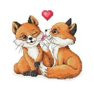 Zestaw do haftu - Zakochane liski Zestaw do haftu zawiera: kanwę czystą typu Aida (100% bawełna) o gęstości 54 oczek/10 cm (14ct), mulinę, igłę oraz kolorowy wzór graficzny. Zestaw nie zawiera ramki. Rozmiar w krzyżykach: 108 x 108 Rozmiar w cm:
