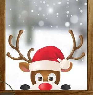 Śmieszny renifer, naklejka świąteczna na okno. Naklejki są wykonane z trwałej folii samoprzylepnej, odpornej na zabrudzenia i warunki atmosferyczne (naklejki można stosować wewnątrz i na zewnątrz pomieszczeń).