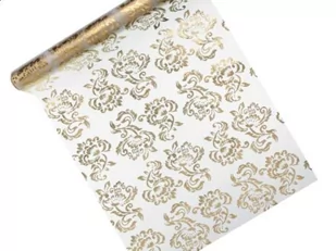 Organza biała z nadrukiem dwustronnym z jednej strony nadruk jest srebrny, a z drugiej złoty. Wymiary: 36 cm x 9 m.