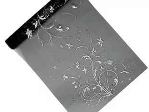 Organza czarna ze srebrnym nadrukiem welurowym. Wymiary: 36 cm x 9 m.