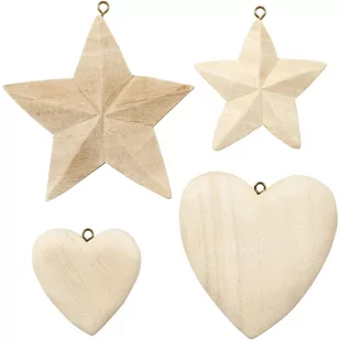 solidne, pulchne serduszka oraz gwiazdki z oczkiem do zawieszenia wymiary: serce 7,5x7,5 cm + 5,5x5,5 cm, gwiazda 8,5x8,5 cm + 6x6 cm w opakowaniu znajdują się 4 sztuki