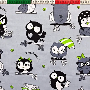 Tkanina bawełniana sówki szalone z zielonym na szarym tle