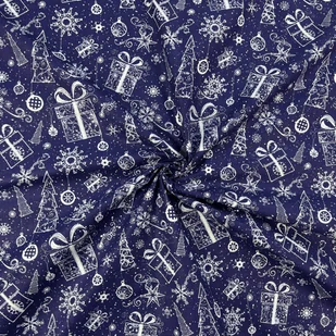 Tkanina bawełniana wzór świąteczny kontury choinki z prezentami na granatowym tle