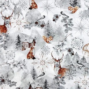 Tkanina bawełniana zimowy las z reniferami szaro brązowy