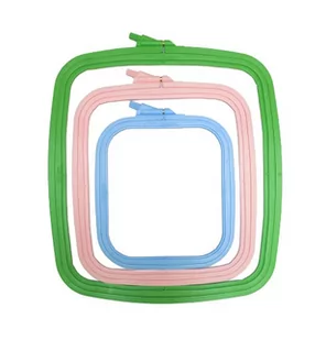 Zestaw 3 prostokątnych, plastikowych tamborków Nurge Tamborki wykonane są z wysokiej jakości plastiku. Posiadają dwie gładkie obręcze, które zaciskając się napinają jednocześnie naciągnięty między nimi materiał. Naprężenie materiału regulowane jest pokrętłem. Obręcze posiadają wyżłobienie i są do siebie dobrze dopasowane, dzięki czemu nie powstają między nimi szpary. Tamborki doskonale sprawdzą się przy wykonywaniu haftów ręcznych.