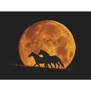 Zestaw do haftu - Konie w blasku księżyca Zestaw z muliną zawiera: kanwę czystą typu Aida (100% bawełna) o gęstości 54 oczek/10 cm (14ct), mulinę, igłę oraz kolorowy wzór graficzny. Zestaw nie zawiera ramki. Rozmiar w krzyżykach: 216 x 162 Rozmiar w cm: